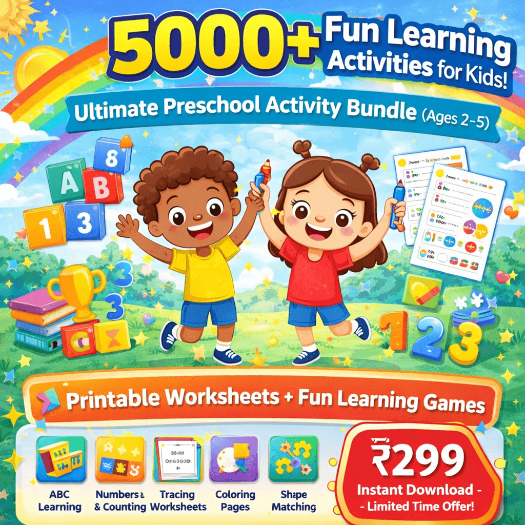 This bundle includes 5000+ ready-made kids worksheets and fun learning activities designed for preschool children. It covers alphabets, numbers, shapes, coloring, puzzles, tracing, and many more engaging activities.
